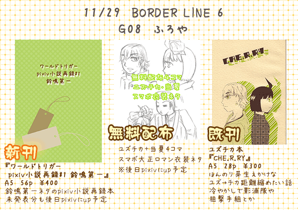 11/29のワートリオンリー「BORDER LINE 6」で発行する予定の、pixiv小説再録本のお知らせですー。