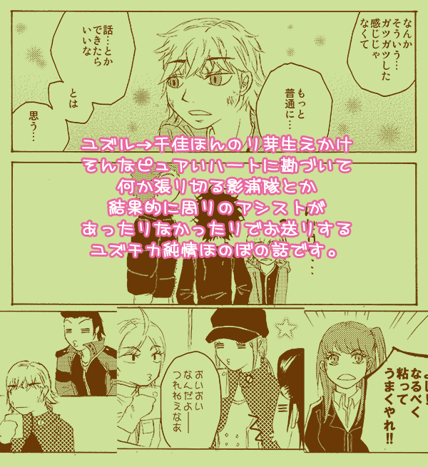 ●20151022:とらのあな様にて書店委託していただける事となりました。こちらの作品ページをご参照ください>http://www.toranoana.jp/mailorder/article/04/0030/35/82/040030358238.html ●20151011:自家通販始めました。こちらからどうぞー>http://www.chalema.com/book/endre_krg/item.php?id=endre_krg-20151011181738 ※原作123話で遊真が携帯所持している描写が出てきましたが、それ以前に描いた作品の為、遊真が携帯持っていない設定で話が進んでおります。申し訳ありませんがご了承いただければ幸いです。 10/4 SPARK10にて発行予定の新刊サンプルですー。 画像は全てクリックすると大きいの見られます。 今回2色刷表紙なので、画像はイメージです。こんな感じで作りたかったんですという願望。当日現物を見るのがどきどきですわー。 20151004発行『CHE.R.RY』 A5オフ表紙2色刷28p ¥300 WT ユズル→千佳なユズチカほんのり純情片想い本です。頑張って距離縮める為に連絡先聞こうとする話。 事情を察した影浦隊が何か張り切ったり、遊真と鋼さんとか、当真さん茜ちゃん出穂ちゃんとか周りの人達の意識無意識な関わりがあったりなかったりしながら、もだもだと4コマ形式で進んでいきます。 以下本文サンプルです。抜粋なのでページちょいちょい飛んでますー。 本誌で突如やってきた新キャラのユズルくんが、千佳ちゃんそっと意識してるの微笑ましくてたまらないです。ユズ→チカなユズチカかわいらしい。キュンキュンする。という想いを一心に詰め込んだ本となりました。 最初は師匠の鳩原さんを慕っていたところから、雰囲気似ているって意味での意識なのかなー?とも思っていたのですが、「オレも玉狛のムービー見ようかな…」のくだりで確信しましたね。恋だね。千佳ちゃんと話すたんびにそっと頬を染めている純情少年がたまらんです。 基本はユズル→千佳(気付いてない)って感じが理想なのですが、対戦時のユズルくんがめっちゃ男前だったので、ちょっともう少しだけ報われても良いかなって思うようになってきました。これからの関わりが楽しみですわー。対戦後に千佳ちゃんがユズルくんに「やっぱりすごいね!」とか言ってあげたら良い!言うんだ!とか夢も見ていました。まぁ今後に期待です。 |