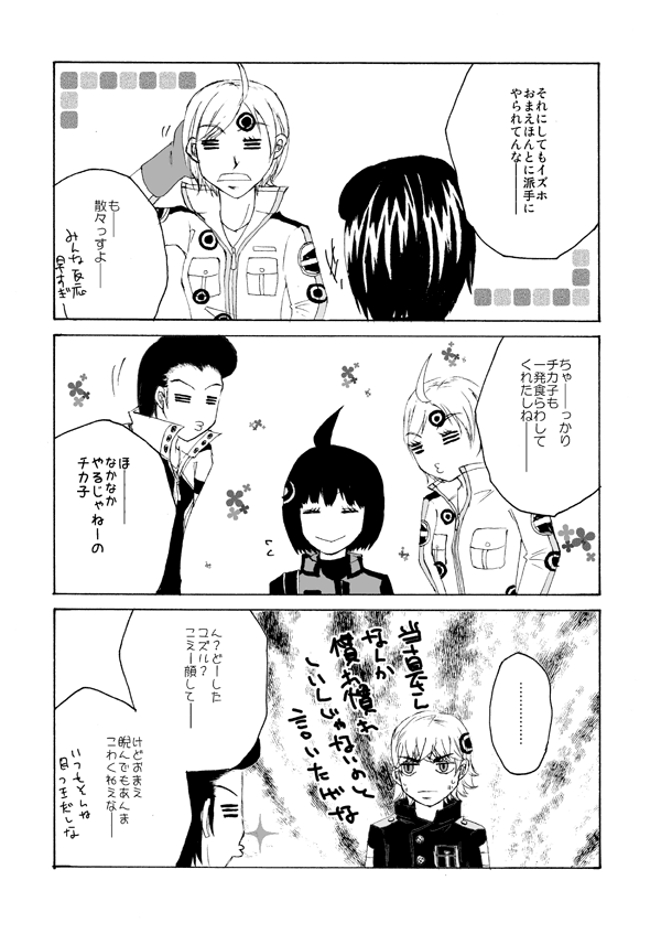 WT本誌感想はトゥイラーでぽちぽち叫んでいるのですが、ぼちぼちブログにもまとめてきたいなぁと思って久々に感想記事。あっちでの呟きをベースに加筆修正。 さてエネドラッド再び。つうか遊真がさらりとエネドラッド呼びしてたの笑った。エネドラも嫌なのかそれは。ラッドみたいなザコと一緒にされるのは我慢ならんのかと考えると納得。 予想はされてたけど、やはり「神」選びについてハイレインとヒュースは意見を異にしているのだろうなー。ヒュースは国家の犬くらいに忠誠心高いと言われているから、国を救う「神」という名の人柱については、普通に考えると受容しているのかなぁと思う。なので神候補の中にハイレイン達が除外したい人物がいるのかな。と思うけど、まだまだ情報が不足してるからわからんね。どきどき。この辺もいよいよ明らかになるのだな。 エネドラが示唆するヒュース側の事情というのが、彼との今後の関係性の鍵を握るんだろうな。修は一応、可能性を捨てずに情報を集めているように見える。期待をかけている感じではなく、ひたすらなりふり構わぬ姿勢というのが彼らしい。ヒュースの件は今はどっちにも転びそうで、どうなるか楽しみだなー。個人的には完全にボーダーの一員になるというよりは、アフトの者という立ち位置はそのままで理解者・協力者になってくれたらなぁと期待しているけど、あれだけボーダー入りさせるには問題山積だと提示されたから、もし仲間になるならなるでその辺も順に解決させてくんだろうと思うし。そういう意味でも楽しみです。 ところで良く見たらエネドラッド、今回はふかふかの座布団の上にお座りになっておるのなw なかなか良いご身分じゃないかw つかこのエネドラッドさんの鎮座してるとこどこだろ、何かキッチンの一角っぽく見えるが…。この子確かコンセント的なもの繋がないと動かなかったんでは、流石に前より自由になってるように見えてもワイヤレスではないよねぇ。家電並みの電力で動けるスペックなのかね。 そして素敵まんまるエンジニアさんの名前が分かった!寺島雷蔵!21歳組!映画好き族か!良い存在感してるよねーこの人、せっかく名前も出たのだし今後の活躍にも期待(。-∀-)鬼怒田さんが「雷蔵」って下の名前呼びしてんのも、信頼厚そうで出来るエンジニア感あって良い! ヒュースは玉狛でうまい飯、エネドラは本部でおもしろ映画と、玄界が誇る文化を駆使して懐柔されてんのが面白いですねw 両者とも一見享受しているように見えるが、やはりなかなか心は許さずいるのがしたたかで、遠征に選ばれるだけの精鋭ぶりを感じさせるなぁ。次のランク戦の話もまだ出ていないし、ここから暫くはアフト属国来襲と遠征に向けての話にシフトしていくのかなー。 一方の狙撃手合同訓練。もうこれはサービスシーンの宝庫でしたね!訓練結果の見開き2頁で誰が誰を打って打たれてをくまなく見ているだけで三連休過ごせますよこれ。素晴らしい。そこまで計算しての事ですか葦原先生…(盲信)。 当真さんは本気出したらこんなもんじゃないつか全当て余裕なんだろうけど、わざわざ一定以上の距離の相手だけ当てるとか縛りプレイしてそうだな。以前に「当たらない弾なんか撃てるかよ」てな事を、当たらないつもりで撃つなんて出来るかよって意味合いで言ってたけど、当てて当然の的にまんま当てんのも面白味ないと思ってそうだ。的当て訓練の感じ見ても。 狙撃手部隊の荒船隊の中では、何だかんだ本職の2人が荒船さんの上いってんのもさりげなく細かい描写で良いねー。荒船さんの被弾2はひとつは当真だけど、もうひとつは穂刈なのかなー画的にも(。-∀-)穂刈達の方が被弾も多いけど的中も多いからポイントは上、なんだけど、実際の戦闘ではランバネインの超火力猛射を回避して生き残ったのは荒船さんで、攻撃手的な身のこなしがあってこそなのだなーと考えるとやはり奥が深い。荒船PARメソッドの有用性もまたひとつ明らかになった感も。そして遊びっぽく訓練やってんのに被弾ゼロの当真さん、一応ガチ戦だった黒トリガー争奪戦の時に位置割り出した木虎達嵐山隊やっぱすげえなって改めて感じさせたりね、新しい情報が出る度に遡って楽しめるからワートリは深面白いのですよ…(*´∀`*)。 この訓練は居場所を知られたら圧倒的不利になる狙撃手が、まず居場所を知られない・知られないで目標を狙撃する・その後捕捉されないよう身を潜める、を身につける訓練なのだろうな。基本居場所がバレたら敗けだから、同じ相手からの被弾は一度きり。とは別にして狙撃を元に相手の位置を割り出す訓練も兼ねてると。んで狙撃手組が親睦を深める場もこうして描かれているのですね、攻撃手は個人戦で鎬を削って戦友的な友情を深めてるようだし、それぞれの界隈での人間関係見るのも面白いなぁ。銃手・射手も個人戦は攻撃手達と混合なのだろうか、てのもその内描かれるかなぁ楽しみ。万能手