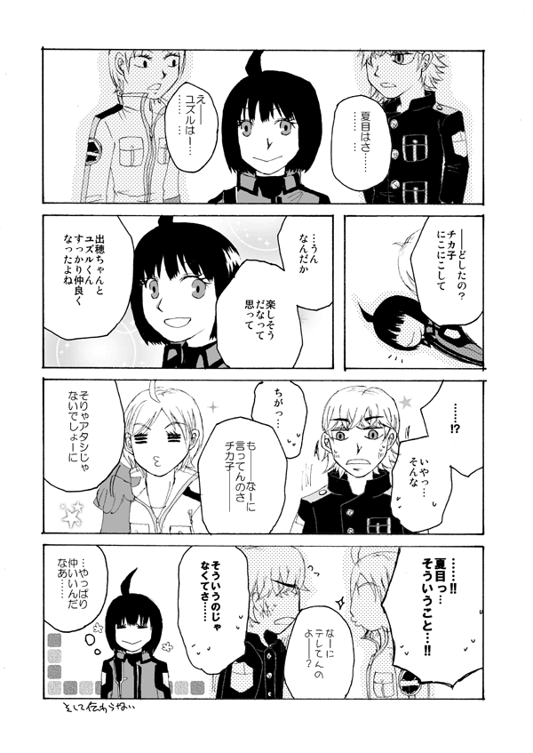 ワールドトリガー本誌119話感想。Twitterで投稿したログをベースに加筆修正。 冒頭の影浦隊の隊室ひでえwwwww汚部屋wwwwwヒカリちゃんジャージ姿でこたつで惰眠むさぼるとか、これまで出てきた部隊の中でダントツにおうち感すごいです。しかもアカン方のやつ。良く見たらヒカリちゃんの近くにみかんがダン箱でたんまりだし、これは生活感溢れまくりというかもはや住んでますね(確信)。 そもそも初めて影浦隊の隊室がお目見えした時、ソファに置いてあるクッションの存在が何かカゲさんの近寄りがたそうな印象とアンバランスに感じたんですよね。妙にほっこりなアットホーム感があった。思えばカゲさん初登場の殺伐とした感じから、すっかり自由にまったりマイペース部隊な印象になったなぁ影浦隊…。太刀川隊とは違った方向性のゆるさがあって、良いです。 にしても「お客が来るなら言えよ~!」からの「ゾエとカゲも呼ぶか?」がじわじわ良い。何その一家大集合。末っ子がお友達しかも女の子連れてきたからみんな呼んだ方が良い??とか仲良し家族なの、ほんとかわいい。 ヒカリちゃんの千佳ちゃん出穂ちゃんへの「コタツ入ってみかん食う?」は、玉狛を訪ねた時の栞ちゃんの「このどらやきいいやつだから、食べて食べて」のと同義なんでしょう。お客人はまずもてなす、ボーダーのオペちゃん達は気遣いが良く出来る子達ですね。 ユズルがヒカリちゃんの事「ヒカリ」って呼び捨てなのにはドキッとした!この子また私の心をときめかせる…!ユズルのこういうちょっとした時に見せる男の子っぽさが、時々とても胸ときめきます。好きだわ…男の子してる思春期少年いい…。 最年少のユズルがこうならきっと、カゲさんもヒカリ呼びかなぁ。みんな基本名前かあだ名で呼び合ってる距離の近さは、今までの中では意外となかったタイプの隊で、やっぱ面白い影浦隊! 冒頭の影浦隊隊室から萌え所満載過ぎていくらでも見てられるけど、ユズルくんが千佳ちゃんに与えた秘策はお見事のひと言じゃ足りないインパクト。それが師匠の鳩原さんがきっと悩みながら模索していたであろう案が陽の目を見た、と思うとグッとくるよなぁ…。きっと人が撃てない事を悩みながらも努力を重ね自分が戦うスタイルを確立していった鳩原さんを、ユズルも間近で見ていて、いなくなってしまってからは力になれなかった事を悔しく思ったりもしたのかなって。淡々と語るユズルの姿に、何かちょっと切なさを覚えました。 トリオン体でも戦えない人は相手が生身だったらという考えが離れない、という、殆ど人間と変わらない存在を撃つ事について割り切れない人も少なくないんだな。だけど千佳ちゃんは訓練なら撃てるから、慣れるというより視野を変えてみれば良いのでは、という切り口で知恵を授けたユズルが本当に見事だった。レイジさんが長い目で見守ろうとしていたのは勿論しっかり千佳ちゃんの事を見てきての判断だし優しさも滲み出ているけど、今の千佳ちゃんは「もっとチームの力になりたい」という感情が芽生え始めていて、だけど一足飛びには出来ないから発想を変えながら出来る事からやっていこうよ、というのが今回のアプローチなんだよな。それが階段の一段目となってトリオン体で戦う事が様になってくるかもしれないし、このやり方を極めて独自のスタイルを確立していくかもしれない。今回の提案がそのまま解決策になる訳ではなく、けれど千佳ちゃんの歩む道にひとつ選べる方向が増えたな、って感じがとても良かった。「正解はひとつじゃない」のだ。 ユズルは千佳ちゃんが人を撃てない事を「苦手」と表現していて、今週の出穂ちゃんは「弱点」と言っているんだよね。敢えて言葉を選んでるんだろうな、ルビで点も振ってあるし。 ここら辺にもユズルの優しさと心情が表れているようで、「人が撃てない事は決して負い目を感じることじゃない」って思いがあるんだろうな、と感じた。ある意味でレイジさんと根底の気持ちは同じとも言えるかも。やっぱり鳩原さんの事がずっと心の中に残っているんだろうな…出会った当初に「雨取さんもそう思う(人を撃てないとダメだという)派の人?」って聞いたの、鳩原さんが色々言われてたのユズルもつらかったんだろうなーって今思うと感じたり。 ユズルが千佳ちゃんの優しさを尊重したままチームの力になれるよう手を貸してくれたのは、人を撃てなかった鳩原さんをそれでも尊敬していて、あの時力になれなかったから今度こそはって強い気持ちがあったんだろうな。その姿に胸打たれるし、本当に鳩原さん慕ってたんだなって切なくなるね…。 ユズルが千佳ちゃんにほんのりした好意を抱いているのは間違いないと思うけど、単にそれが安易な動機付けじゃなくて、慕ってた師匠の苦悩を間近で見て力になれなかった自分も思ったりして、色んな気持ちを抱えながら千佳ちゃんの力になろうとしてくれてんのほんと良いです。男の子っ